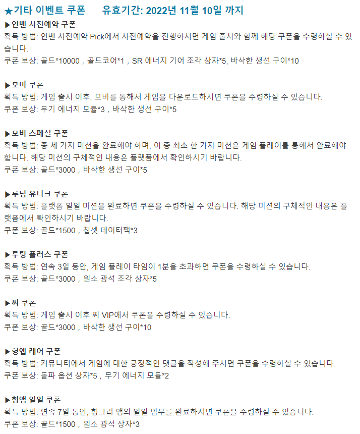 상기 사전예약 쿠폰은 중복으로 수령이 불가능하지만 기타 이벤트 쿠폰은 중복으로 수령이 가능하다. 물론 인벤 사전 예약 쿠폰은 사전예약을 해야 받을 수 있으며, 그 외에는 이벤트성으로 사전예약을 하지 않아도 충분히 가능하기에 도전해볼법 하다. 하지만 아시겠지만 게임 오픈 전에 공개하는 쿠폰은 사실 그렇게 엄청난 보상은 아닐 가능성이 높으니 그냥 하셔도 무방할 듯 하다.