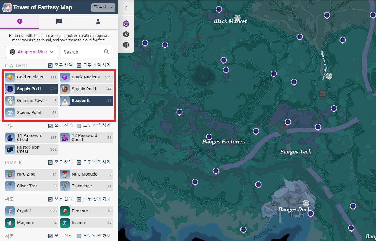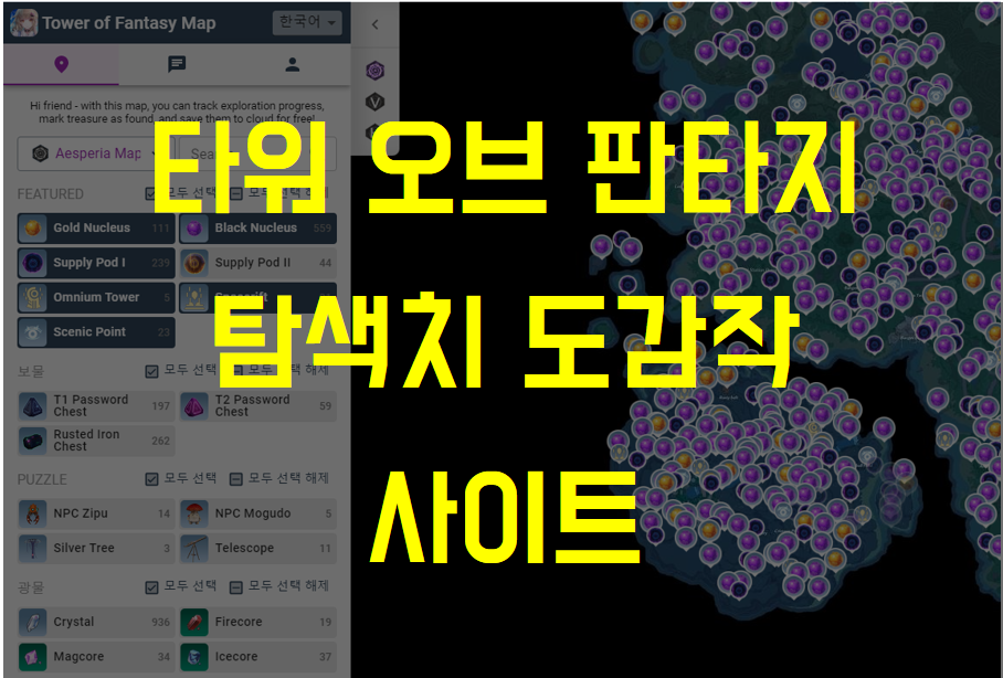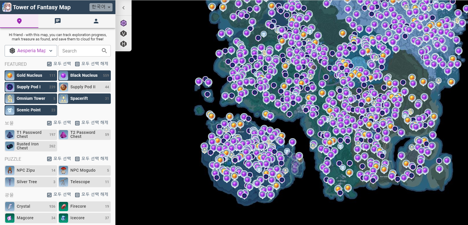 아래 사이트는 타워 오브 판타지 맵을 구현한 것으로 블랙코어나 골드코어 위치 뿐 아니라 보급캡슐, 워프게이트, 관광명소 등 다양하게 확인할 수 있다. 또한 로그인을 하면 내가 점령했던 곳들은 표시하여 동선 낭비를 줄일 수 있는 Tower of Fantasy Interactive Map 사이트이다.