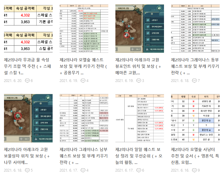 티스토리 블로그를 하기 전에 네이버 블로그를 한 1년 반 운영했었다. 요즘도 맛집 같은 것은 네이버를 통해 올리곤 한다. 작년에 제2의나라를 했을 때 모든 퀘스트나 도감작 위치들을 공유하기도 했었다. 왜냐하면 도감작을 하지 않고 다음 단계로 넘어가는 것이 진짜 내 자존심상 허락하지 않았다.