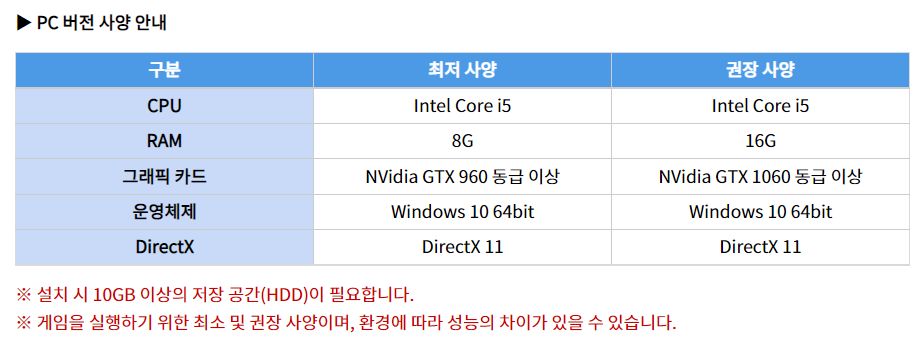 서머너즈워 크로니클 PC 버전의 최저사양 및 권상사양은 아래와 같다. 최저 사양은 i5에 램8g, GTX 960 이상이다. 최저 사양도 이정도면 다른 모바일 게임 PC 버전 사양보다 높은 편이다. 그래픽 보니까 그렇게 높아보이지 않았는데, 꽤나 리소스가 많이 필요한 게임인 듯 하다.