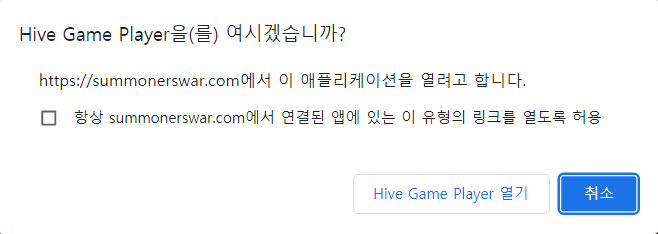 웹에서 Hive Game Player를 여는 방식으로 이전에 넥슨 게임이 이런 방식을 많이 사용했던 기억이 있다. 대부분 많은 유저분들이 기억하는 그 창이다. 진짜 반가운 창이다.