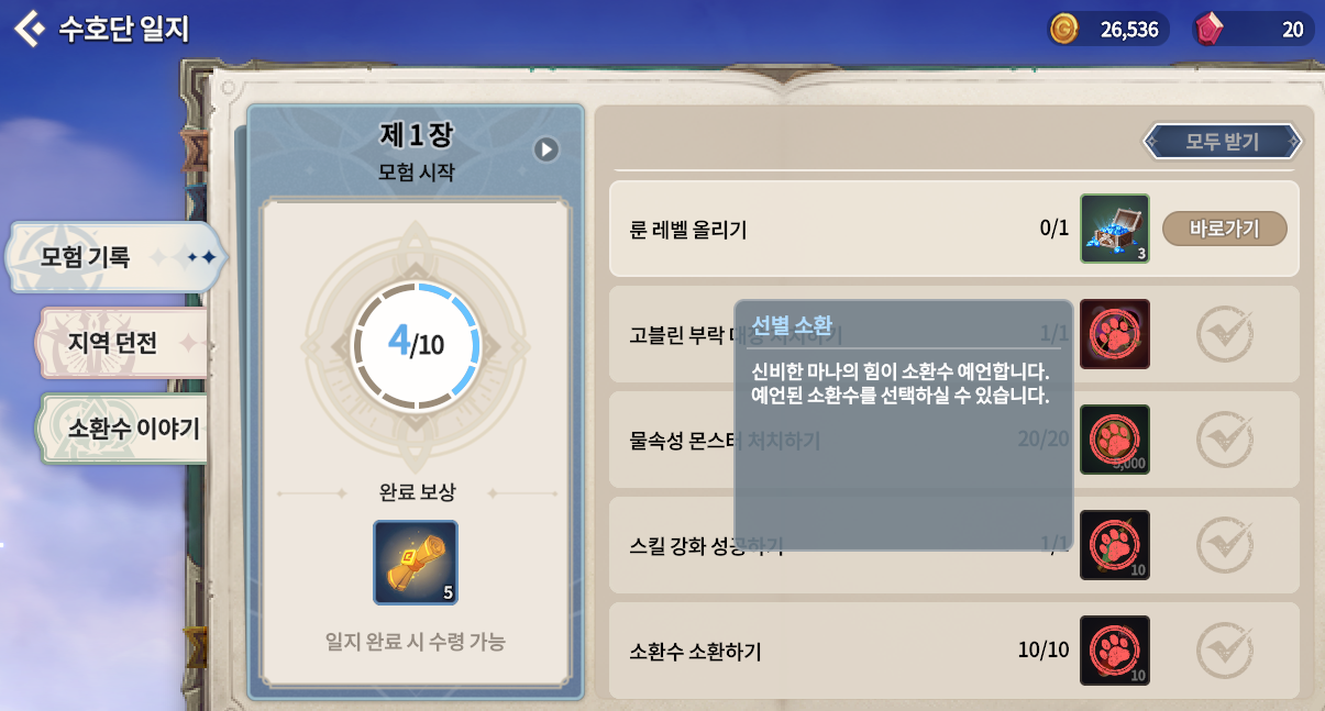 하지만 아예 타이밍이 없는 것은 아니다. 캡쳐본이 없긴 하지만 제1장 모험시작의 퀘스트 중 고블린 부락 대장 처치하기 퀘스트를 완료하면 선별 소환권을 준다. 선별 소환권은 총 30번의 기회가 있으며, 계속 10번씩 뽑기를 하는 것과 마찬가지다. 그 곳에서 우리는 좋은 5성을 뽑을때까지 진행하면 된다.
