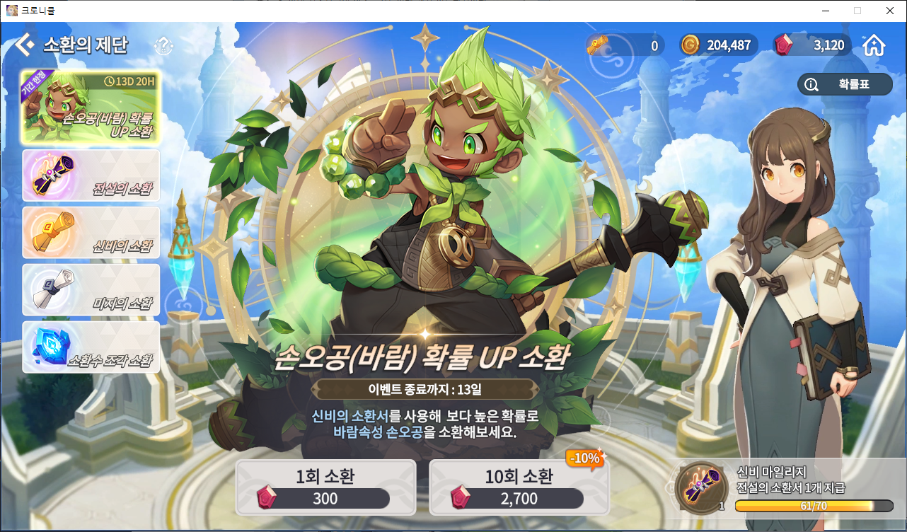현실 1100원 짜리 하나 했음에도 불구하고 벌써 61개의 소환을 해버렸고, 천장이 얼마 남지 않았다. 그만큼 자주자주 많이 뿌린다는 의미이다. 다른 게임처럼 10번 소환권을 주는 구간이 있으면 거기까지 하시면 된다고 이야기하겠지만 여기는 그렇지 않다. 작게 여러번 나눠준다.