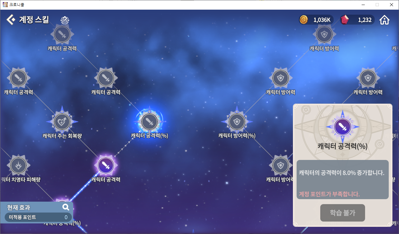 계정 스킬은 진짜 미세하게 능력치를 올려주긴 하지만 이것 또한 모이면 큰 효율을 자랑할 수 있을 것이다. 퀘스트로 얻는 보상을 따라가다보면 계정 레벨 및 스킬은 자동적으로 따라오는 보상인 셈이다.