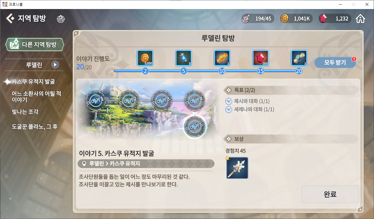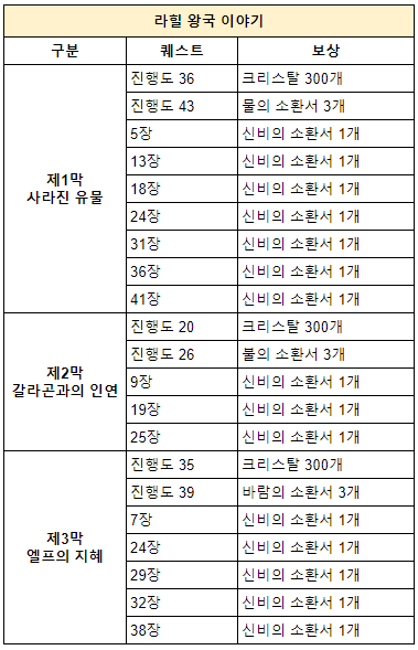퀘스트를 밀고나서 얻는 보상은 꽤나 짭짤하다. 전체 완료하면 크리스탈 900개, 물/불/바람 소환서 3개씩, 신비의 소환서 15개를 얻을 수 있다. 결국 뽑기권을 24개를 얻을 수 있다는 것이다. 부캐 2개를 돌렸다면 48개의 소환서를 얻을 수 있다는 의미이다. 여기에 아직 정리는 안했지만 지역탐방 퀘스트까지 더해지면 양은 더 많아질 것이다. 해당 내용은 추가적으로 다루도록 하자.
