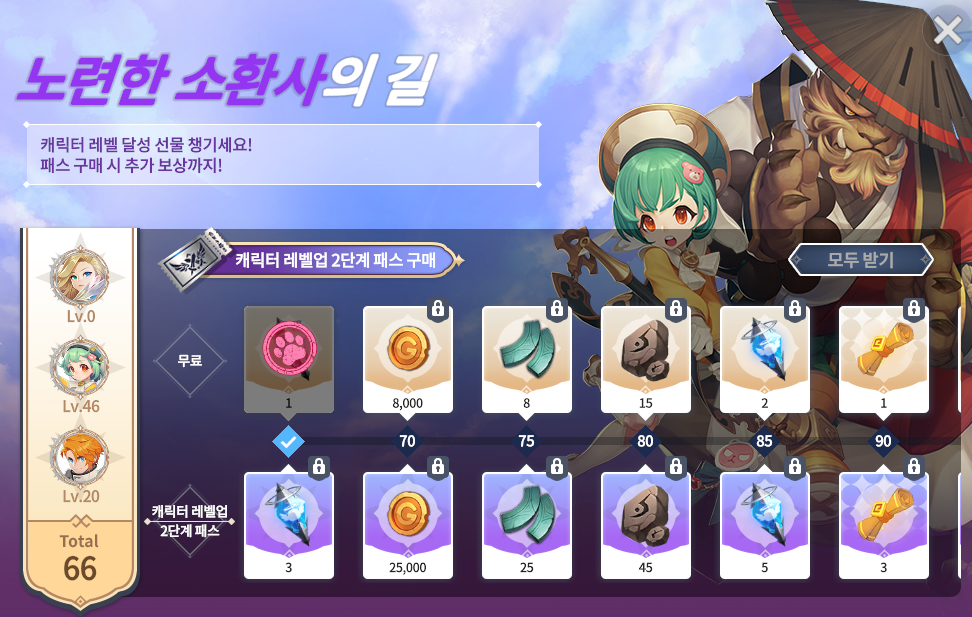 이벤트 중 '노력한 소환사의 길'이라는 이벤트를 한다. 물론 추후에 이 글을 읽으시는 분들은 없을 수 있겠다. 참고용으로 캡쳐해놓은 사진이니 걱정하지 않아도 된다. 여기서 특이한 점은 한 캐릭의 레벨이 아닌 3개의 캐릭터의 레벨이 하나로 통합되었다고 보면 된다. 제2의나라 시스템과 똑같다고 볼 수 있다. 아마 직업이 5개였다 그럤을 것이다. 그래도 서머너즈워 크로니클은 3개라 다행이다.