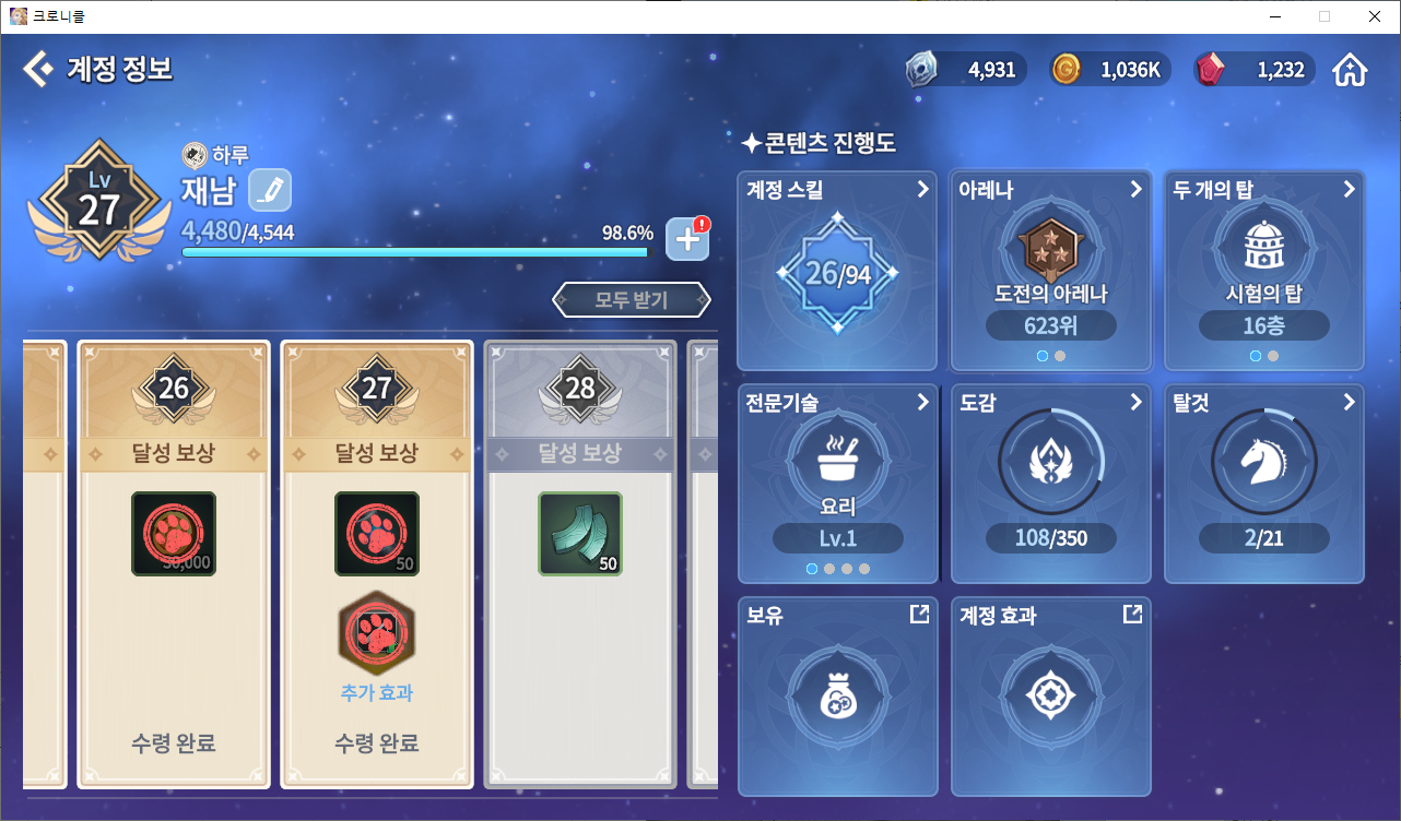 퀘스트 보상도 당연히 달달하다. 무과금 입장에서는 서머너즈워 크로니클에서 신비의 소환서가 얼마나 소중한지 알기 때문이다. 하지만 부가적으로 얻을 수 있는 것들도 많이 있다. 계정 레벨은 3캐릭터가 공유하는 레벨로, 도감이나 계정 스킬을 공유가 가능하다.