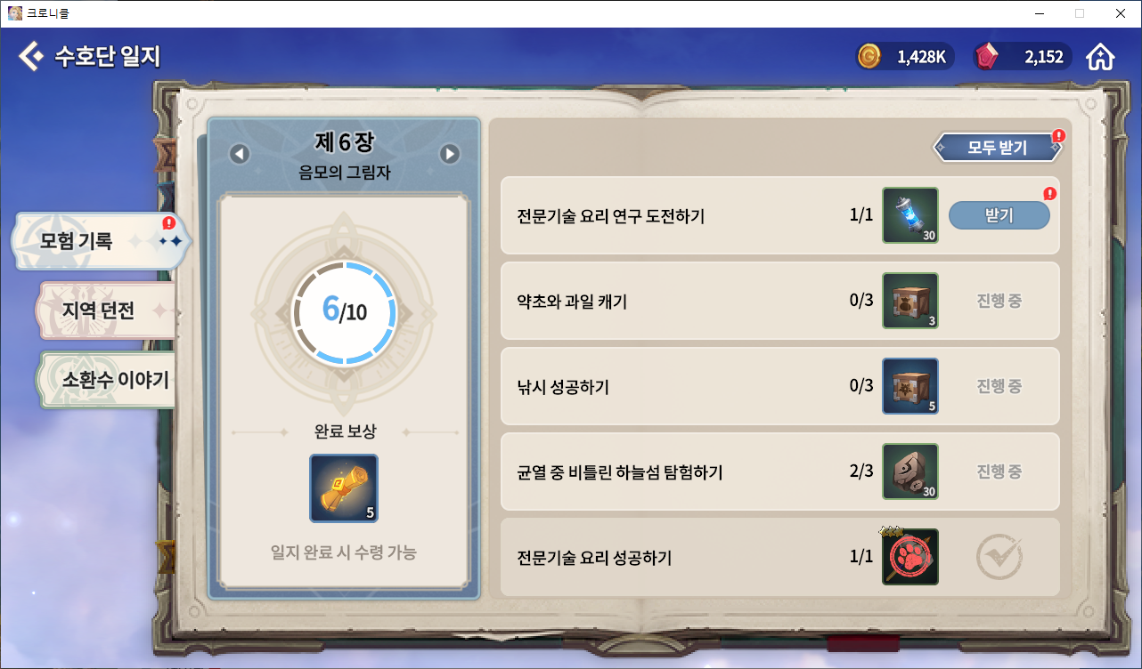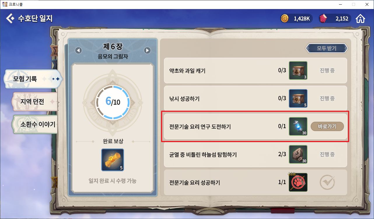 수호단 일지의 모험 기록 중 제 6장 음모의 그림자 퀘스트 중 하나가 전문기술 요리 연구 도전하기이다. 같이 하는 회사 동료도 그렇고 전체 채팅에서도 많이 물어보신다. 그래서 나도 깰 겸 한 번 해보려고 한다. 다행이도 퀘스트 깨지 전에 알게 되어서 캡쳐도 예쁘게 될 것 같다.