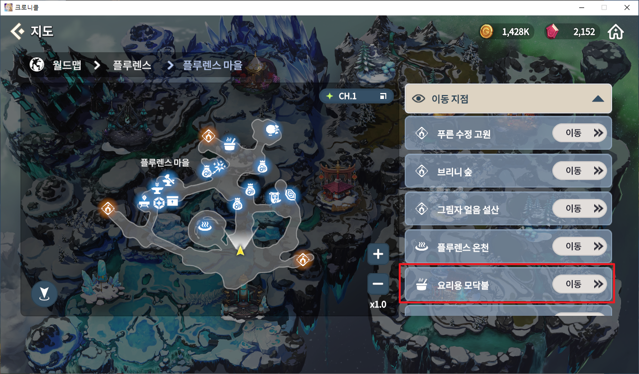 요리를 하기 위해서는 요리용 모닥불 근처로 가야한다. 요리용 모닥불은 어디서든지 갈 수 있기 때문에 맵을 클릭하여 이동지점을 통해 요리용 모닥불로 가야한다. 요리를 하려면 당연히 불이 있어야 하기에.
