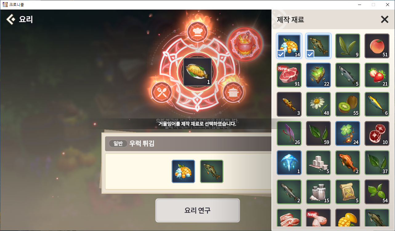 우럭 튀김을 만들기 위해 망고랑 생선을 넣는다. 누가봐도 우럭튀김은 커녕 먹을 수 있는 음식이 나올 것이라고는 생각이 들지 않는다. 그래도 퀘스트를 깨는 목적으로는 충분한 재료 투자라고 생각한다.