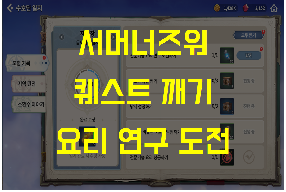 아주 간단하게 수호단일지의 모험기록 퀘스트, 전문기술 요리 연구 도전하기를 완료하였다. 사실 크게 어렵지는 않아서 10초 안에 충분히 할 수 있는 퀘스트라고 생각하니 스무스하게 진행해보자. 끝 :)