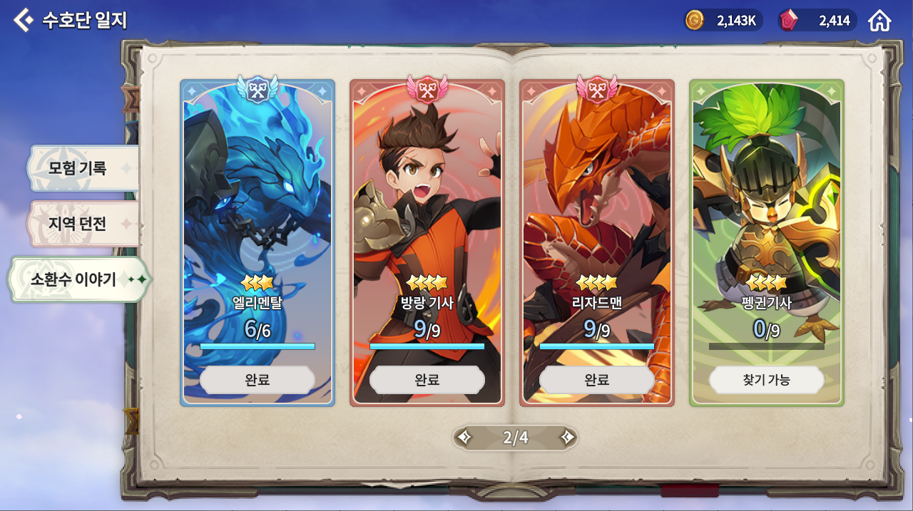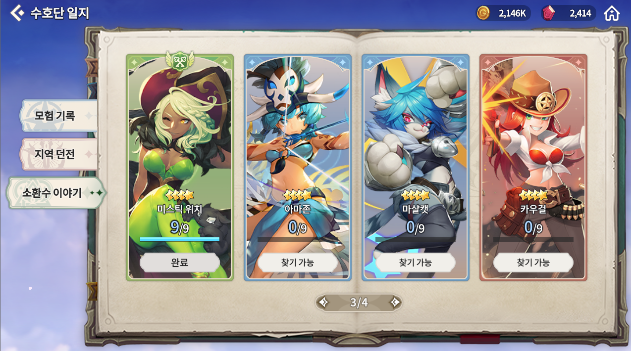 당연히 4성 친구라고 하더라고 수호단 일지의 소환수 이야기에서 얻을 수 있기 때문에 크게 문제가 되지는 않는다. 지금 보니 뽑기권으로 뽑아서 아직 깨지는 않았다. 만약 클리어 하고 스킬 레벨업을 했다면 조금 더 편하게 클리어 할 수 있지 않을까 생각이 든다.