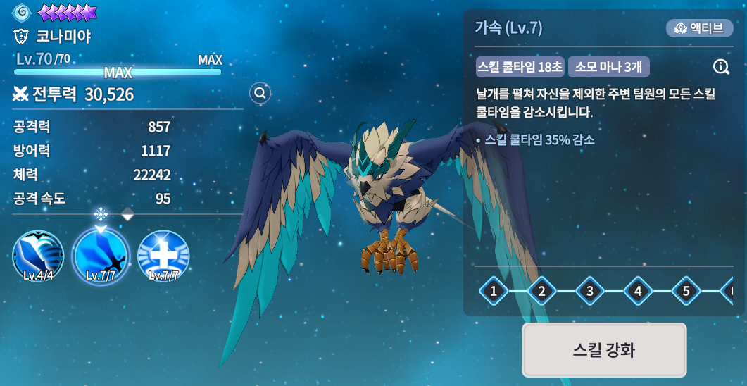 물 가루다를 좋게 평가하시는 분들 중 대부분이 이 가속이라는 스킬을 높게 생각해주는 듯 하다. 소모 마나 3개에 주변 팀원의 모든 스킬 쿨타임 감소를 35%를 시켜준다.