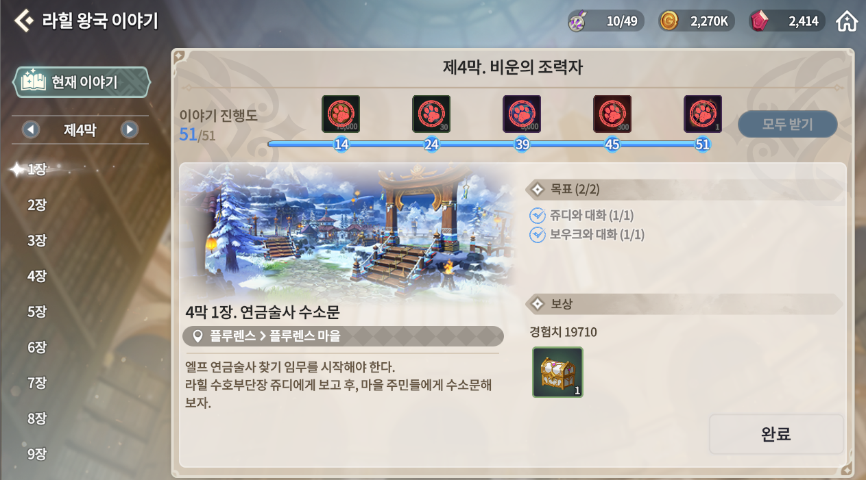 제4막은 비운의 조력자 메인 퀘스트이며 총 51개의 퀘스트로 이루어져 있다. 3막까지는 그냥 아무거나 집어 넣어도 충분히 깰 수 있었는데 4막은 꽤나 어려웠다고 생각한다. 과금을 좀 더 했다면 5성 강한 친구들로 덕지덕지 발라서 깰 수 있었지만 난 돈도 운도 없는 사람이기에 꽤나 머리를 써야했다.