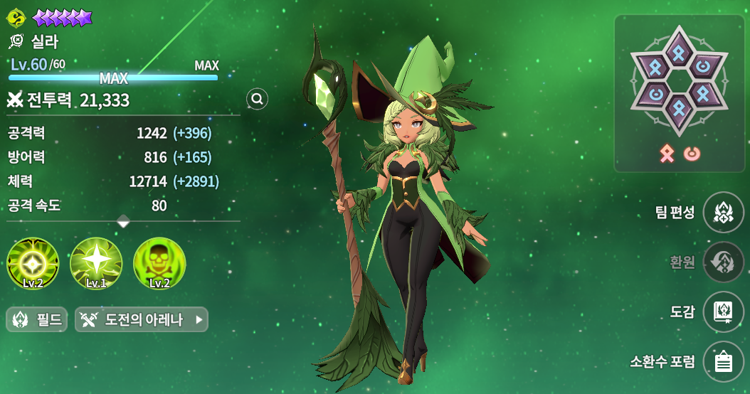 펭귄기사로 운영하다가 1분안에 보스를 잡는 던전을 딜이 부족하여 못잡는 바람에 급하게 키운 풍 픽시이다. 아군 버프와 적 디퍼브를 가지고 있기 때문에 딜이 부족한 상황에서 엄청난 효과를 가져올 수 있다. 보면 아시겠지만 재료가 없어서 그냥 5성에 그쳤었고 지금 보니 룬도 없는 상태다.