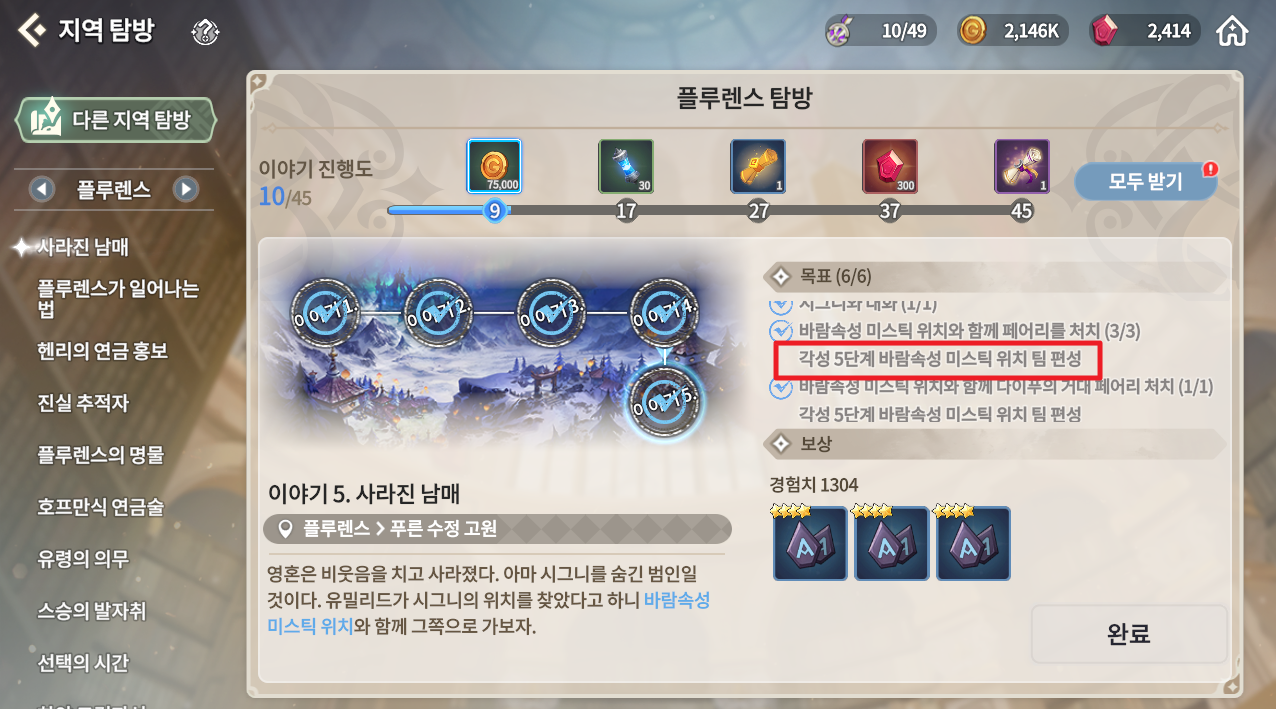 실제 4막을 깰 때는 미스틱 위치 노 각성이었는데 5각성을 추천하는 이유는 서브 퀘스트인 지역 탐방에서 미스틱 위치 5각성을 해야 클리어를 할 수 있는 퀘스트가 나오기 때문에 그냥 미리 해놓는 것이 좋을 듯 하다. 지금 포스팅 쓰면서 플루렌스 지역 탐방을 깨고 있는데 각성 5단계 바람 속성 미스틱 위치를 팀에 편성해야한다. 그럴바에는 메인 밀 때도 좀 더 강한 딜을 넣을 수 있도록 5각성을 미리 하는 것이 좋다.