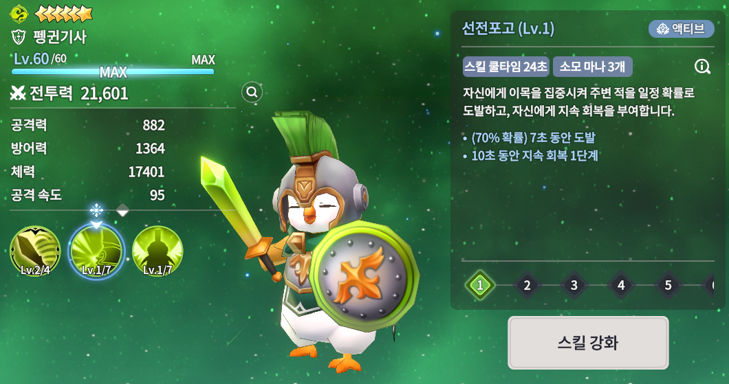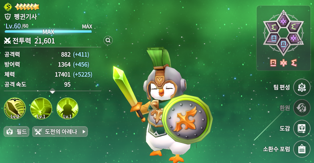일반적으로 딜러 + 탱커 + 힐러 조합이거나 혹은 딜러 + 힐러 + 버퍼 조합으로 많이들 깨는데 딱 아래의 그림처럼 4개의 소환수를 가지고 클리어를 했다. 보스에 따라 탱커가 필요할 땐 펭귄기사를 넣었으며, 딜이 부족할 땐 풍픽시를 넣어서 딜을 끌어올렸다. 왜 이런 선택을 했는지 이야기를 해보자.