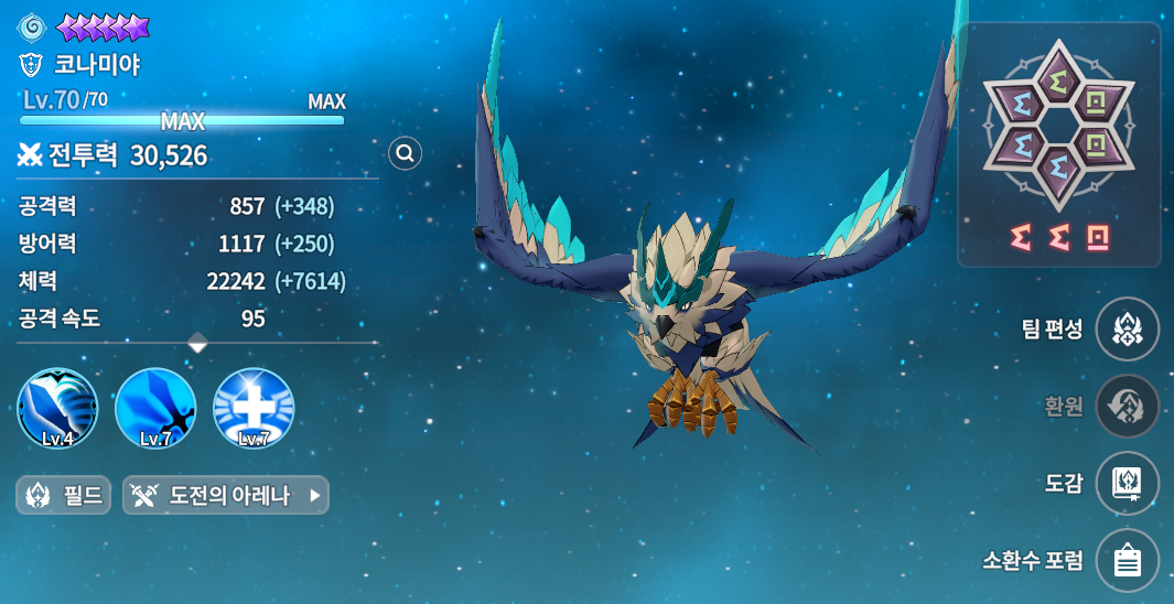 사실 3성 소환수를 쓰는 이유는 스킬 풀레벨 올리고 70 맥스 레벨까지 올리기 위함이고 그 또한 4성이나 5성 몬스터보다 쉬우니 충분히 가능할 듯 하다. 소환수 조각이 부족할 경우에는 어쩔 수 없지만 그래도 웬만하면 다 풀레벨이 가능하다고 생각한다. 여튼 이런 이유때문에 힐러 및 버퍼로 동일 상성인 물 가루다고 사용했다.