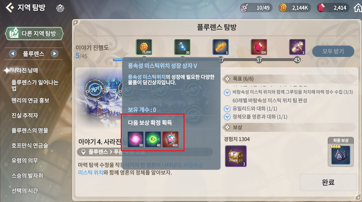 만약 메인 퀘스트를 밀 때 각성할 재화가 부족하다면 플루렌스 지역 탐방 첫 이야기를 깨면 조금 편하게 할 수 있다. 풍속성 미스틱위치 성장상자를 주는데 5각성 하기에는 부족하지 않을 정도이니 충분히 가능할 것이다. 4성이기 때문에 스킬 업그레이드까지는 필수는 아닌 듯 하다.