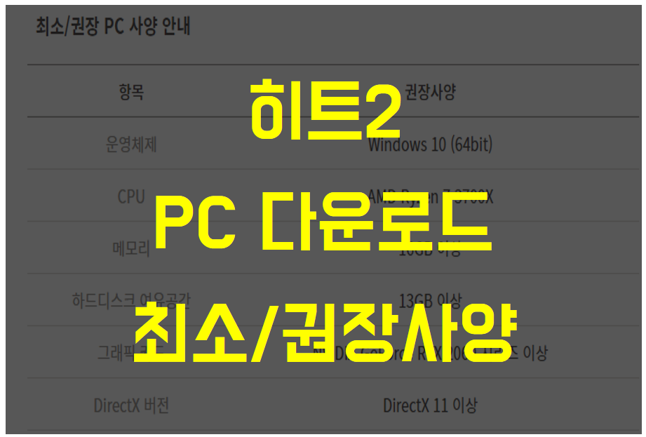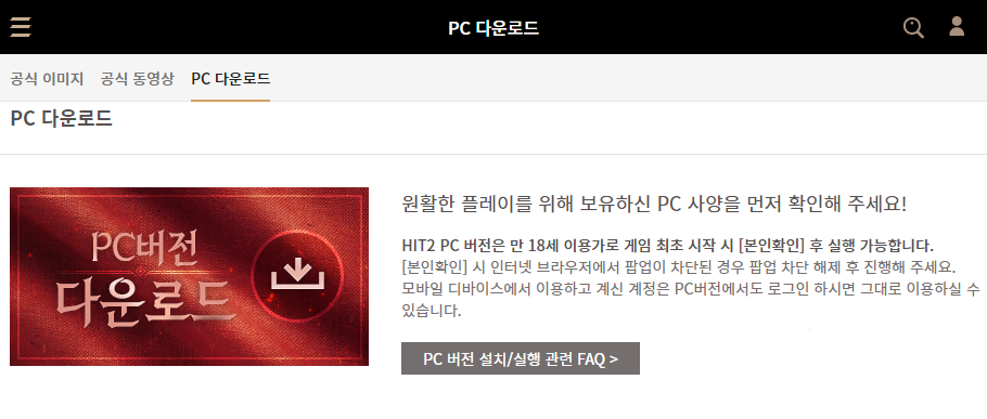 PC 다운로드 링크는 아래를 통해 받을 수 있다. 원활한 플레이를 위해 보유하신 PC 사양을 먼저 확인해주라는 문구가 눈에 확 띈다. 그만큼 그래픽이 좋다는 뜻이 아닐까 싶다. 히트2는 만 18세 이용가로 최초 시작 시 본인 확인이 필수라고 한다.