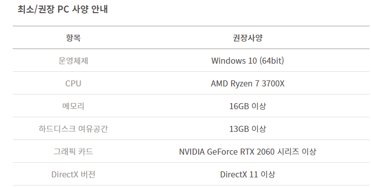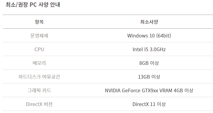 PC 버전의 최소 사양은 윈도우 10에 i5이다. 메모리는 5GB에 하드는 13GB정도. 여기까지만 보면 최소 사양으로는 제격인 사양이지만 그래픽카드가 GTX 900시리즈 이상이 되어야한다. 최근에 한 게임중에 최소 사양이 900버전인 경우는 처음 본 것 같다. 어우. 내 컴퓨터 우는거 아닌지 모르겠다.