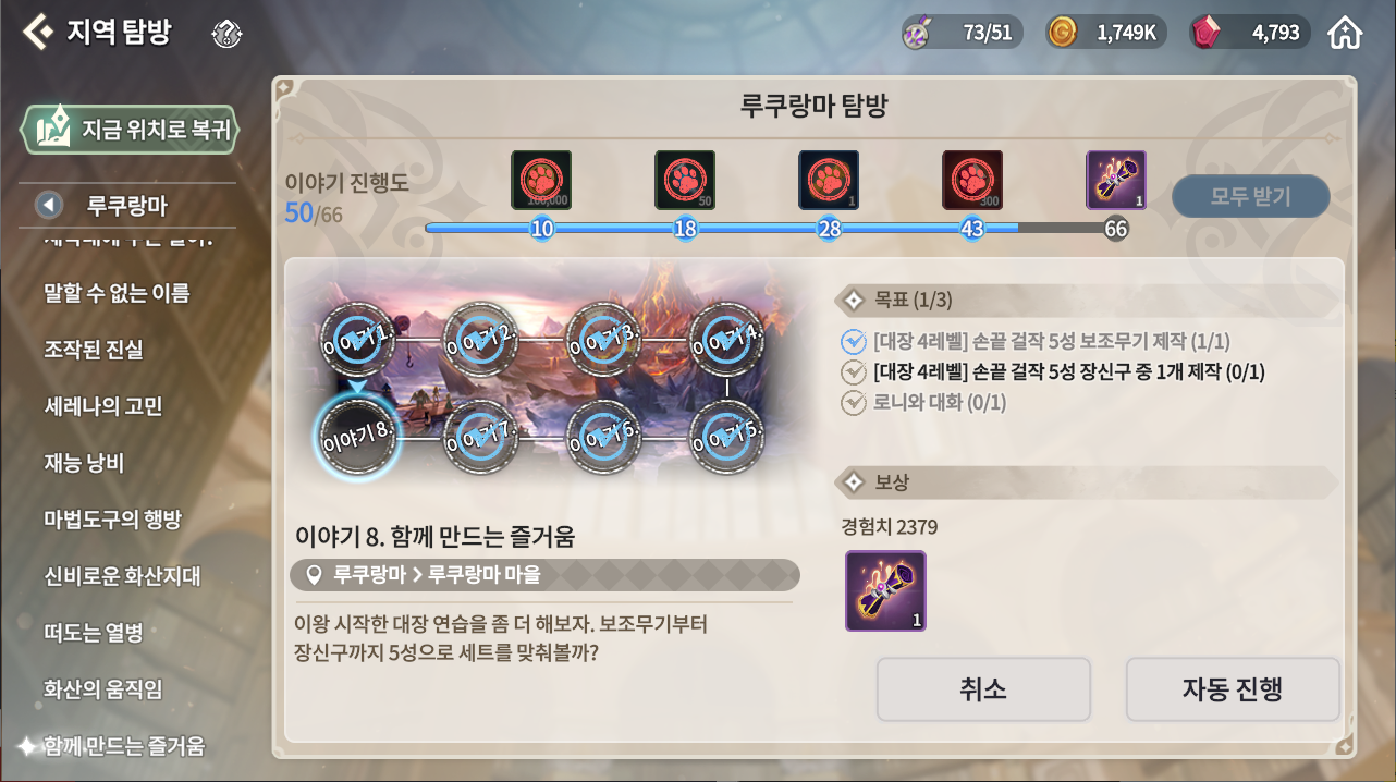 루쿠랑마 지역 탐방 퀘스트 중에 함께 만드는 즐거움이라는 퀘스트가 존재한다. 사실 이 퀘스트는 즐겁지가 않다. 퀘스트를 깨지 위해서는 많은 채광을 해야하는데 서머너즈워 크로니클에서 채광은 '수동'이기 때문이다. 꽤나 많은 양의 채광을 해야한다. 종류도 다양해서 정말 누가 이 퀘스트를 즐겁다 하겠는가.