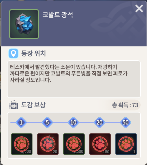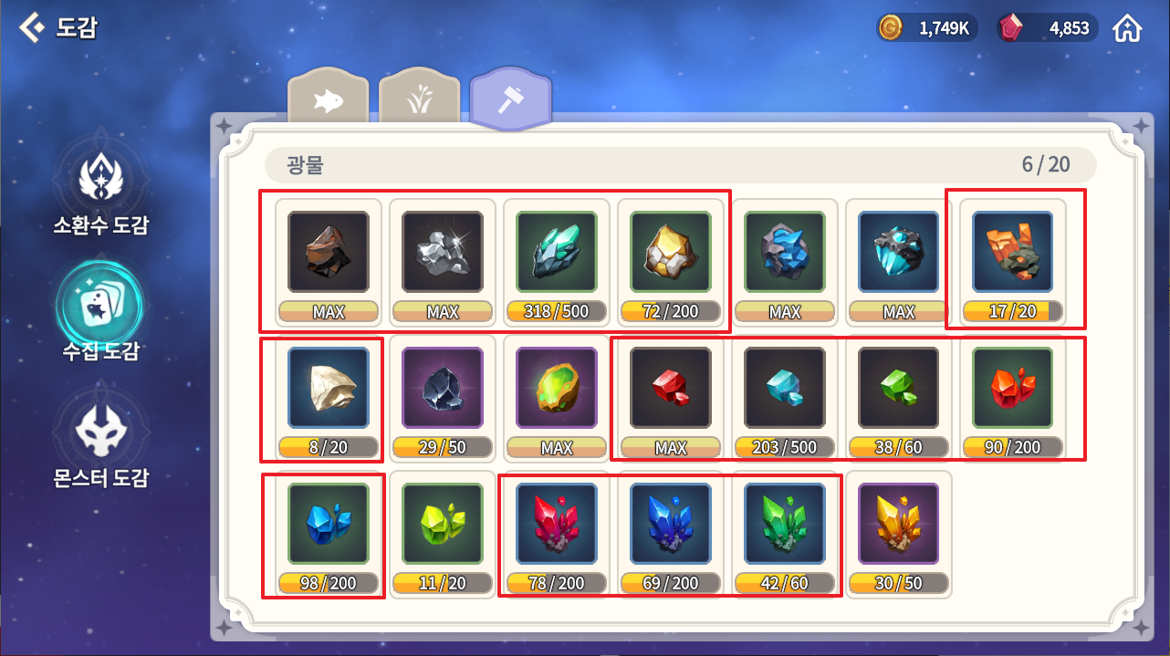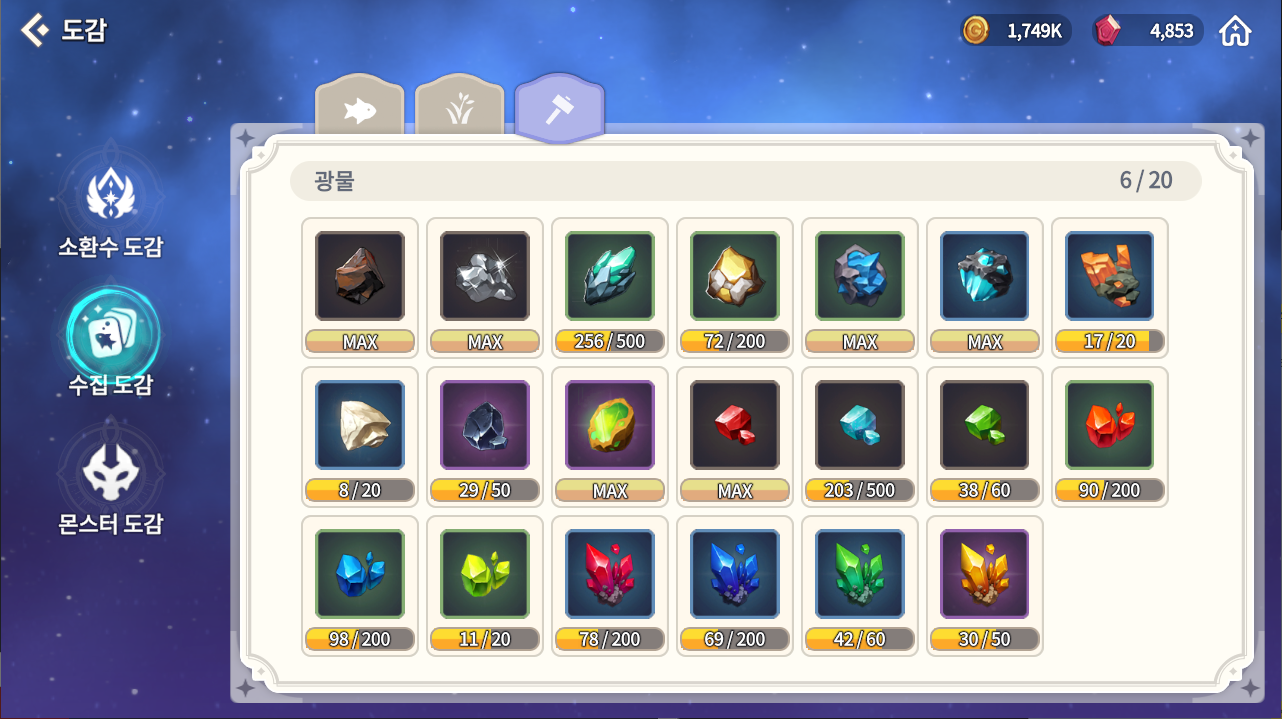 도감 보상도 쏠쏠하다. 물론 노력에 비해 매우 부족한 것은 사실이다. 하지만 도감을 좋아하는 사람이라면 이렇게 적성에 맞는 일도 없을 것이다. 일반 채광가능한 광물은 보상이 좀 아쉽지만 서브로 랜덤으로 나오는 광물 도감은 꽤나 짭짤하다. 크리스탈도 많이 주고 신비의 주문서도 준다.