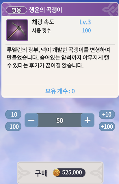 도감작을 하기 전에 준비해야할 것이 있다. 일단 곡괭이를 한 50개 정도 사면 된다. 물론 50개도 나중에 부족해서 좀 더 사긴 해야하지만 처음부터 무리하면 손이 아플 수 있으니 적당히 (?) 50개 정도만 사보자. 50개에 50만원 정도 하지만 도감작으로 골드를 주기 때문에 어느 정도 만회가 가능하다.