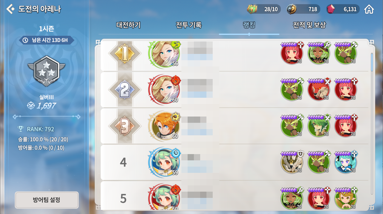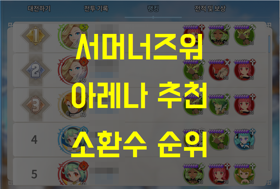 다른 맵들도 참 많겠지만 현재 포스팅을 쓰는 기준으로 아레나 순위를 보고 그 흐름을 파악할 수 있다. 일단 5성은 제외하고 과연 태생 3,4성 중에 어떤 친구들이 포진되어있는지 확인하고 알아보면 내가 어떤 소환수에 집중하면 되는지 알 수 있지 않을까라는 생각에 찾아보았다. 총 랭킹 20위까지 고수분들이 사용하는 태생 3,4성의 빈도수를 판단하여 알아보려한다.