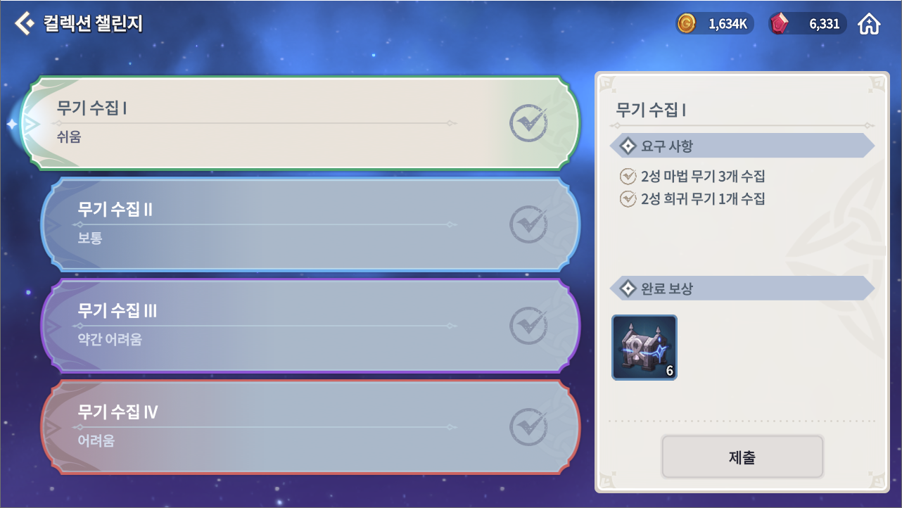 도감이 하나 추가되었다. 바로 컬렉션 챌린지이다. 다른 것들은 크게 문제가 되지 않는데 무기와 룬이 조금 애매하다. 일단 낮은 등급의 장비를 다 갈아버려서 제출할 것이 없다. 그렇기 때문에 지금 꽤나 고민이 된다. 2성 마법무기나 2성 희귀무기 진짜 넘쳤는데 다 갈아버려서 꽤나 곤역이다. 물론 후발주자로 시작하시는 분들은 금방 하실 수 있지 않을까 생각이 든다.