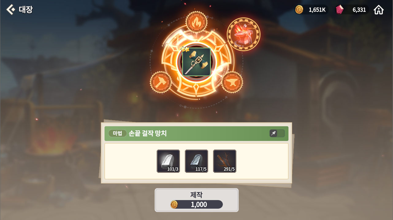 2성 장비 4개를 만들어서 3개는 재료로 바칠 것이고 하나는 희귀 무기인 손끝 걸작 망치를 만드는데 사용한다. 희귀라고 해서 재료가 많이 들어가는 것은 아니어서 충분히 만들 수 있을 것이라 생각이 된다.