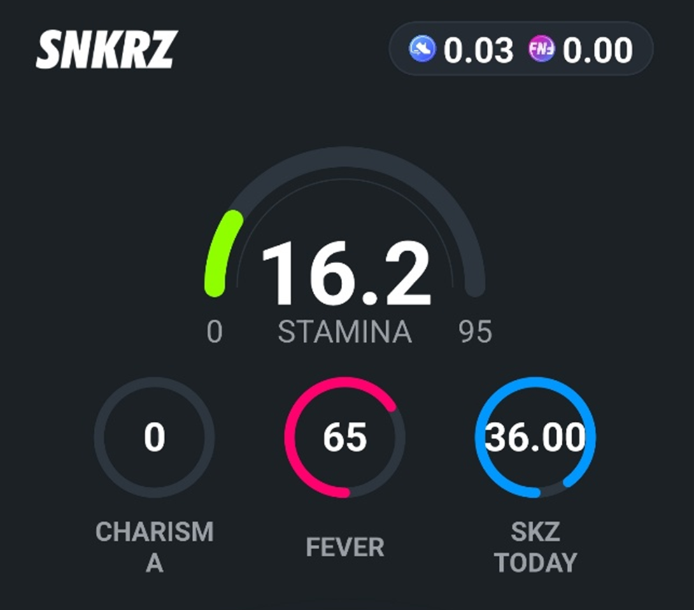 레어 1족 기준으로 스테미너만 가지고 채울 수 있는 코인 최대치는 30SKZ를 채굴할 수 있으며 보통 신발 레벨이 6레벨이면 어닝캡 신경쓰지 않고 채굴할 수 있다. 피버로 인해 터지는 스테미너까지 고려하면 7레벨부터는 눈치 안보고 퍼포먼스를 찍으면 될 듯 하다.