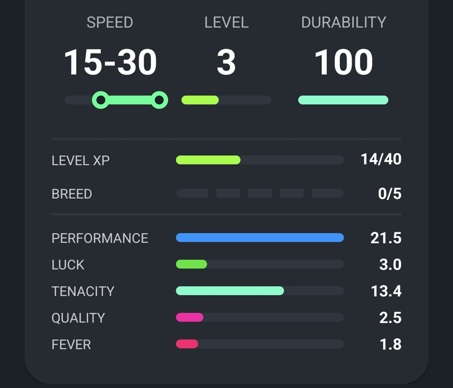 현재 3레벨인 내 신발에는 퍼포먼스 20에 테너시티 10이 찍혀있다. 퍼포먼스 20 기준으로 스테미너 1당 1.3정도 채굴한다. 결국 하루에 채굴량은 28정도 된다는 의미인데, 5레벨까지는 테너시티 찍고 그다음부터 퍼포먼스를 찍어도 될 듯 하다. 어차피 30까지는 퍼포먼스 100, 피버 100, 테너시티 100을 찍기로 했으니까 큰 타격은 아닌 듯 하다.