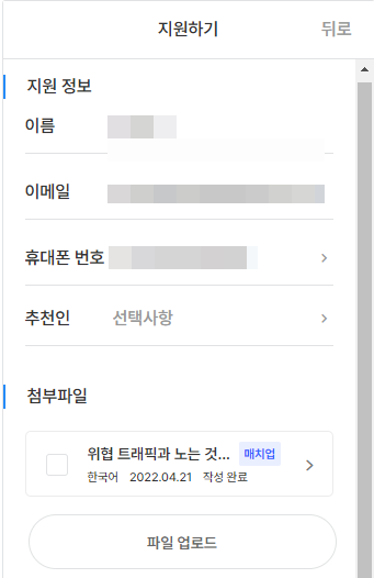 지원 하고 싶은 회사가 있다면 지원하기를 누르면, 심플하다. 추천인 있는가? 그리고 너의 실력을 볼 수 있는 첨부파일을 달라. 끝이다. 정말로 자유 양식이며, 더이상 귀찮게 묻지도 않는다. 그래서 엄청 다양한 회사를 넣을 수 있는 장점이 있지만 그만큼 지원하기 쉽기 때문에 경쟁자도 많다는 생각이 든다.