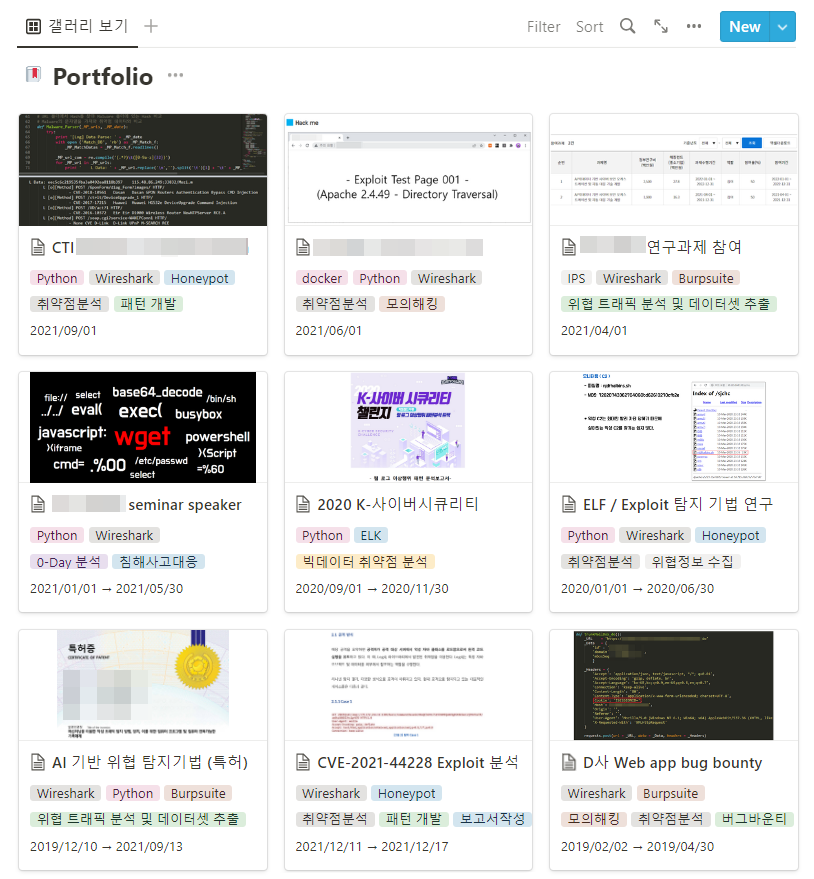 사실 보안 분야의 고수들과 괴물들은 넘치고 넘친다. 나같은 하수 평민이 살아남으려면 진짜 영끌해서 표현을 해야하는데 노션의 갤러리를 활용한 포트폴리오가 그래도 먹고는 살라고 예쁘게 표현을 해준 듯 하다.