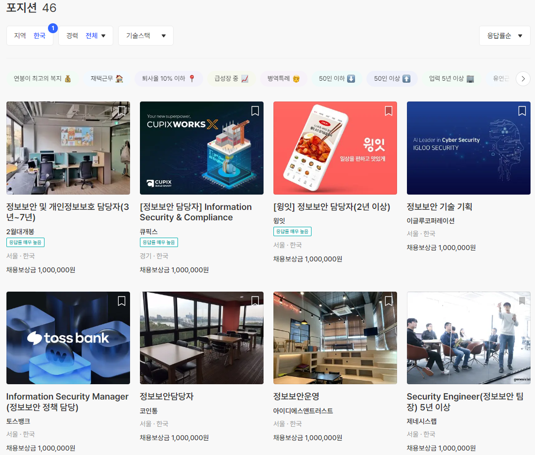 정보보안이라고 검색하면 경력직을 뽑는 회사들의 리스트가 보인다. 원티르를 사용할 정도의 회사면 정말 좋은 회사라고 생각한다. 깔끔하다. 원티드를 통해 면접을 보고 채용이 된다면 채용 보상금을 준다.