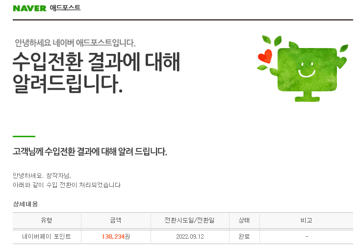 블로그 수익은 모두 네이버페이로 받고 있으며, 10일 ~15일 사이에 수익 전환이 이루어진다. 잠시 잊고있던 사이 애드포스트 수익 신청이 완료되었다는 문자를 받고 호다닥 현금으로 변환하는 김에 포스팅을 써보려고 한다. 언제나 수익전환은 설레는 일인듯 하다.