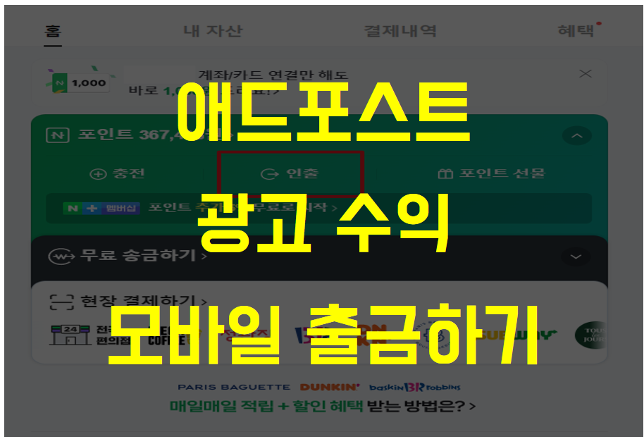 네이버 모바일앱이나 웹으로 접속한 뒤 네이버페이를 검색하여 들어가면 아래의 창을 확인할 수 있다. 인출을 눌러주자.