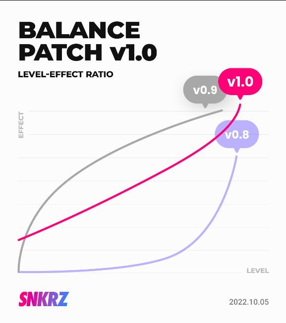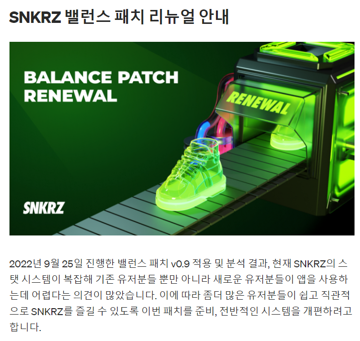 제일 문제였던 것은 최적화를 생각하며 스탯을 올린 사람들은 정말 좋은 채굴량을 나타내는 반면 아직 잘 모르는 분들은 스탯을 이상하게 찍었다가 망하는 경우가 수두룩했다. 그래서 V1.0 스니커즈 패치에는 그런 것 다 필요 없이 레벨에 따라서 채굴량과 수리비를 고정해주었다. 아무것도 모르는 사람들도 그냥 운동만 하면 되는 방식으로.