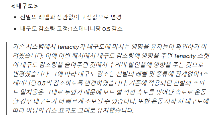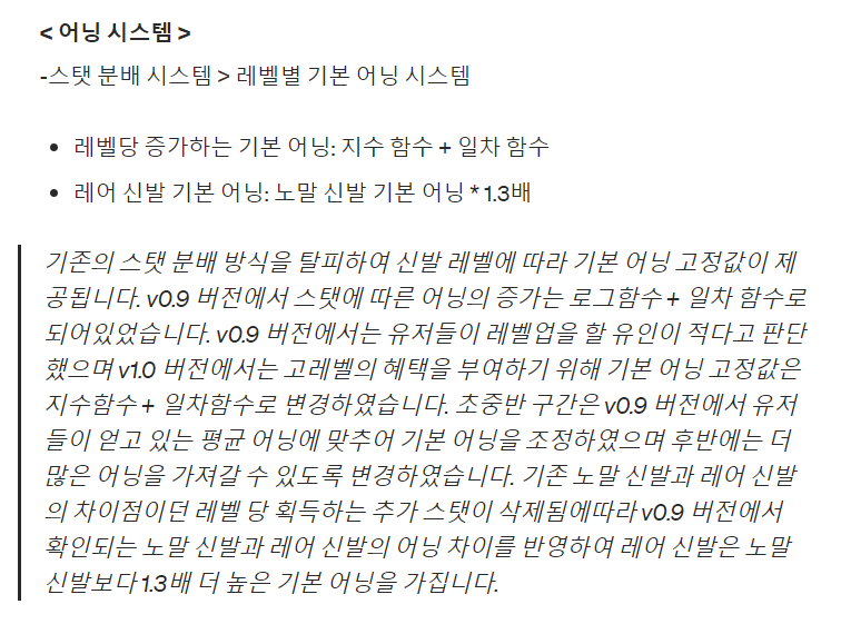 사실 스탯 시스템이 있으면 운영자도 힘들 것이다. 또한 공식 자체가 어렵기 때문에 하나의 값을 바꾼다고 해결될 문제가 아니었다. 또한 유저도 어떤 스탯을 찍어야 하는지 진짜 찍어 먹어봐야 알 수 있는 문제가 좀 있었다. 다만 스탯은 초기화가 불가능해서 테스트로 내 신발을 마루타로 찍고 싶어하는 사람은 없을 것이다.