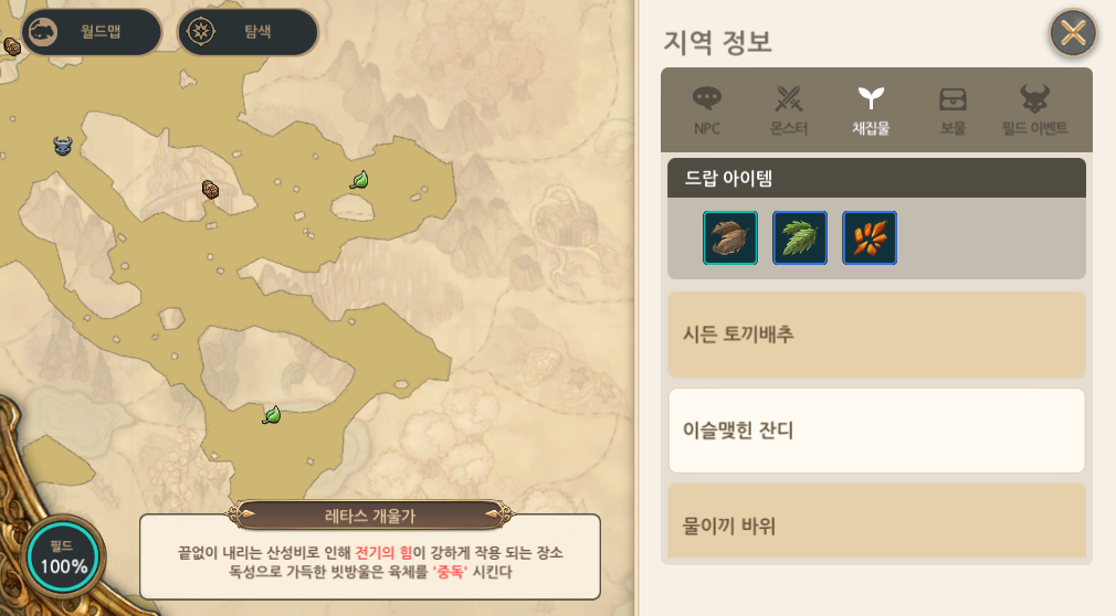 레타스 개울가의 채집물도 총 3개이다. 시든 토끼배추, 이슬맺힌 잔디, 물이끼 바위. 맵이 하도 넓어서 제일 많은 부분만 캡쳐해서 올려두었으며, 이 또한 엘리트 몬스터처럼 오며 가며 만날 친구들이니 미니맵을 잘 보고 움직어야한다.