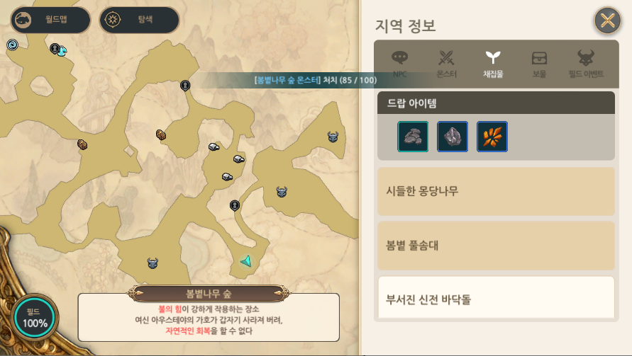 봄볕나무 숲 또한 채집물 관련 퀘스트가 없어서 심심할 때 한 번씩 들려서 채집하면 된다. 시들한 몽당나무, 봄볕 풀솜대, 부서진 신전 바닥돌로 이루어져 있다. 다른건 몰라도 바닥돌은 한 지역에 몰아서 나오는 듯 하니 근처 들를 때 꼭 채집을 하자.