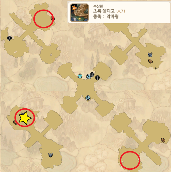 마족수감소 1구역에 존재하는 엘리트 몬스터인 수상한 초록 엘디고는 사실상 각 섬에 다 분포한다고 보는 것이 맞을 듯 하다. 그리고 이제 우리는 다음 에피소드가 없기 때문에 마족수감소에서 계속 지내야하기 때문에 엘리트 몬스터는 한 번은 만나지 않을까 싶다. 아래 별표는 실제 잡았던 곳을 표시해두었다. 워낙 몬스터 잡기 퀘스트가 많아서 알아서 잡아지지 않을까 생각을 한다.
