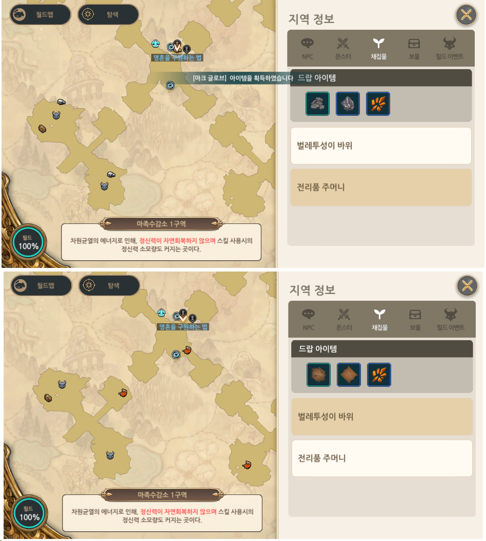 마족수감소 1구역의 채집물은 2개이다. 아이콘들도 달라서 크게 어렵지는 않다. 나오는 지역이 제한되어 있긴 하지만 채집물 관련 퀘스트도 없기 때문에 길에 널려있다. 혹여 구하지 못하신 분들이라면 아래 그림을 참고하시면 된다.