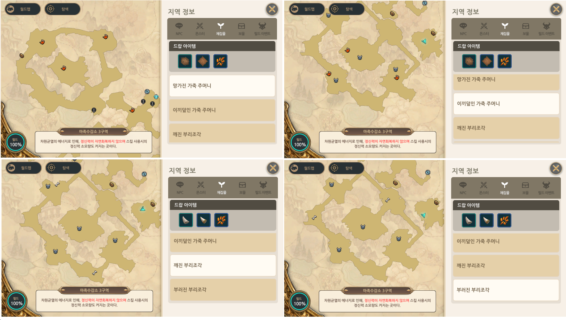 오랜만에 채집물 4개짜리를 본 듯 하다. 채집물 개수도 적고 또 4개 중에 아이콘 겹치는 것도 많아서 꽤나 어렵다. 이름도 왜이렇게 비슷한지. 생각보다 시간 투자를 조금 한 채집물이다. 아마 아래 그림을 클릭하면 크게 볼 수 있으니 만약 마족수감소 3구역에서 채집하지 못한 채집물이 있다면 아래 그림을 참고하면 된다.