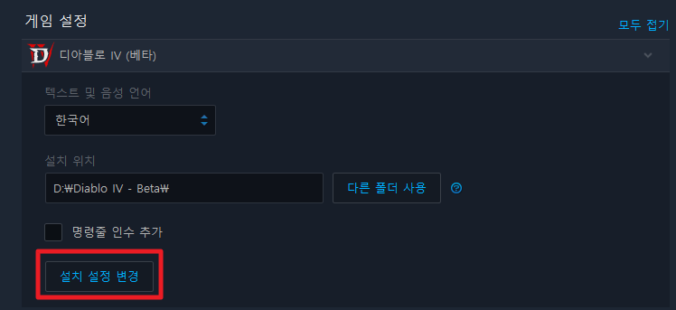 디아블로 4에서 설치 설정 변경에서는 게임 콘텐츠와 언어를 변경할 수 있는데, 언어 변경이야 당연히 한글을 사용하겠지만 베타에서는 한글버전이 완벽하게 구현은 되지 않는다고 공지했다. 우리는 설치 설정 변경을 클릭한다.