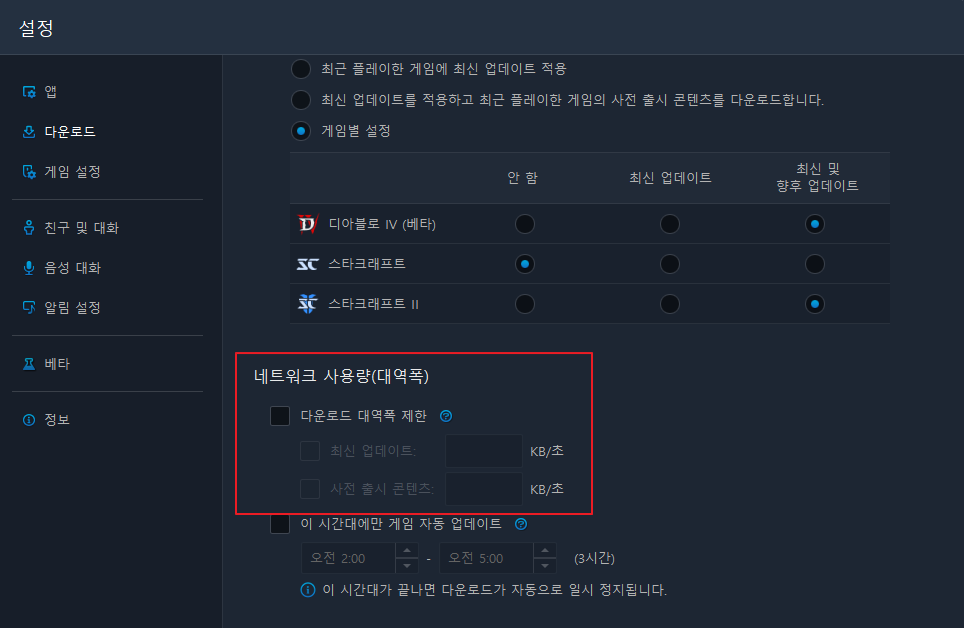 게임 설정에서 네트워크 사용량 대역폭 제한이 걸려있는 경우가 많다. 보통 기본적으로 설정되어 있는 대역폭이 존재하지만 그걸 해제한다면 현재 인터넷 속도에서 최고치로 받을 수가 있다. 기본 인터넷을 쓰는 경우라면 뭐 상관 없지만 기가 이상급의 인터넷을 쓴다면 훨씬 빠르게 다운로드 할 수 있다.