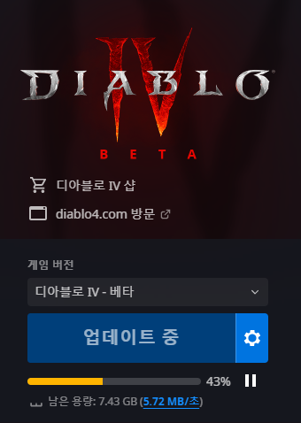 디아블로4 사전 다운로드가 오픈이 되었고, 이제 2시간만 있으면 오픈 베타가 시작된다. 설레는 마음으로 이전 포스팅을 쓸때만 해도 언제 오나 했는데 생각보다 금방 다가왔다. 디아블로4를 설치할 때 어마무시한 게임 크기에 한 번 놀랐고 많은 사람들이 몰렸는지 이게 다운로드 속도가 5메가도 채 되지 않는다.