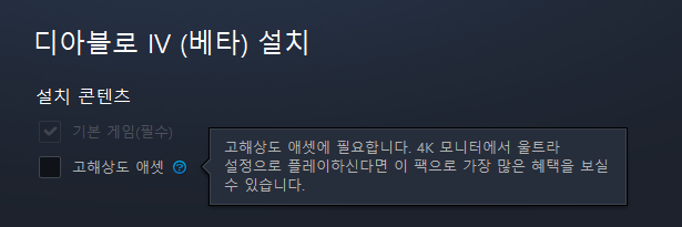 디아블로4 베타 설치의 설치 콘텐츠는 2개가 있으며, 기본 게임 필수는 사용자가 변경할 수 없고 우리가 봐야할 것은 고해상도 애셋이다. 기본적으로 설치 할 때 체크가 디폴트로 되어있기 때문이 이 부분을 해제해주면 된다.
