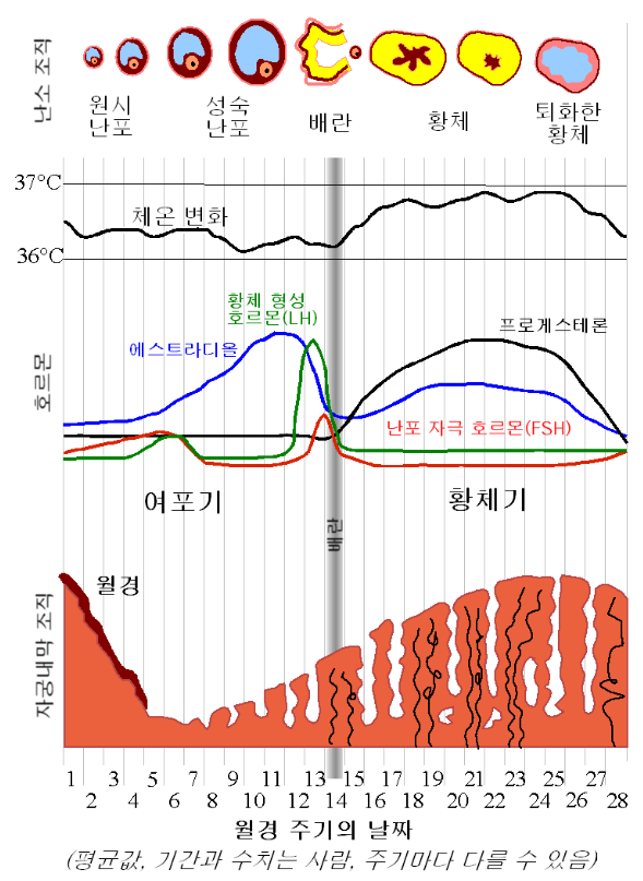 매우 규칙적으로 생리를 하는 여자 기준으로 보통 생리 주기를 28일로 잡는다. 사실 28일로 잡으면 4주로 딱 떨어지기 때문에 계산하기는 쉽겠지만 스트레스나 기분, 혹은 건강 상태에 따라서 이 주기는 조금 줄어들수도 늘어날수도 있다. 하지만 보통 계산은 28일로 한다.